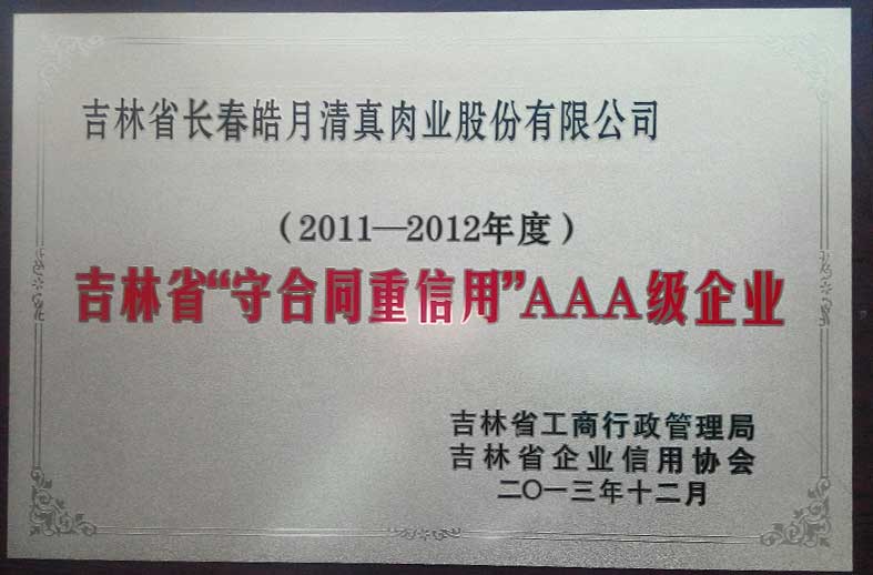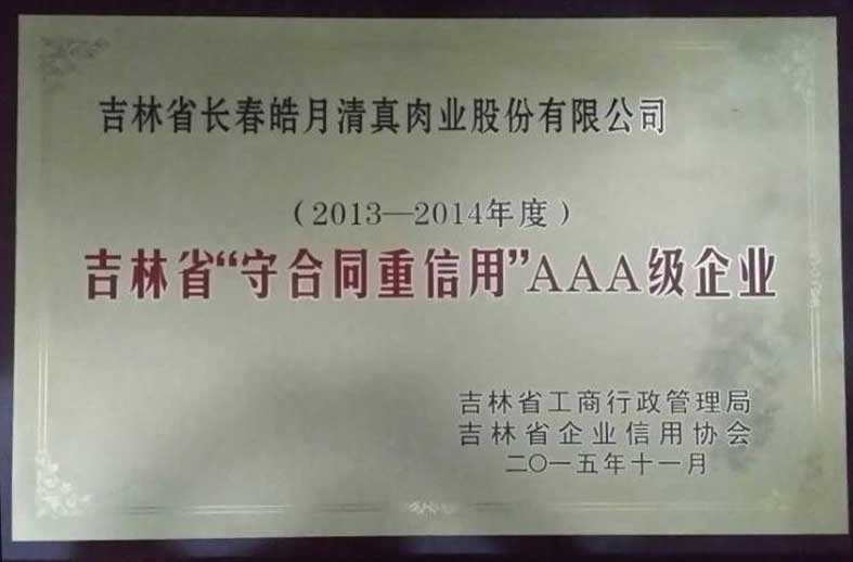 吉林省“守合同重信用”AAA級企業(yè)榮譽(yù)