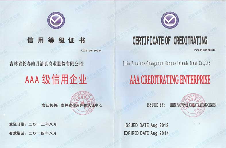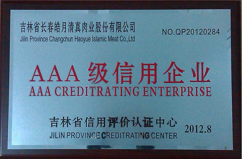 吉林省信用評價(jià)認證中心AAA級食用企業(yè)等級證書(shū)